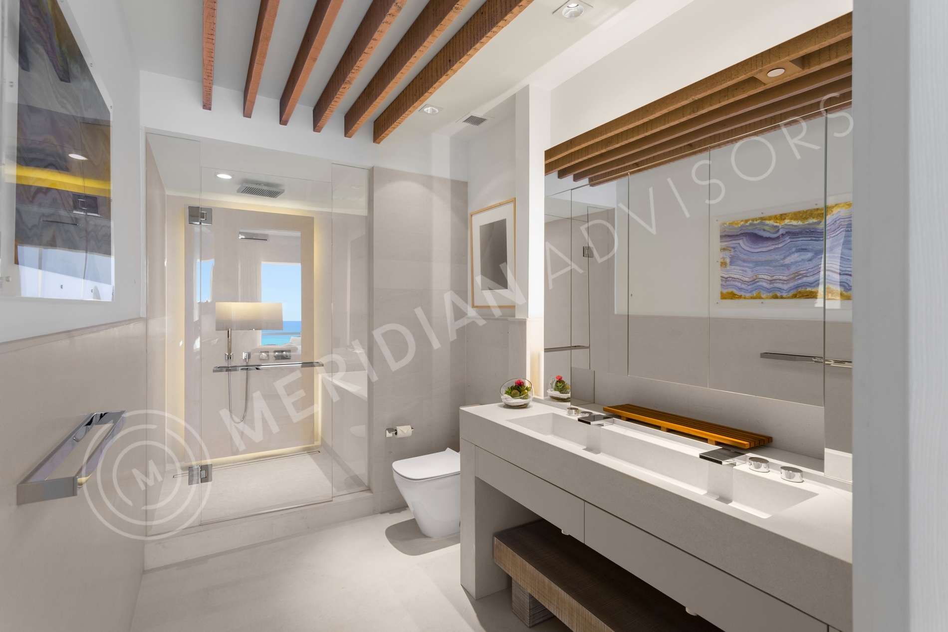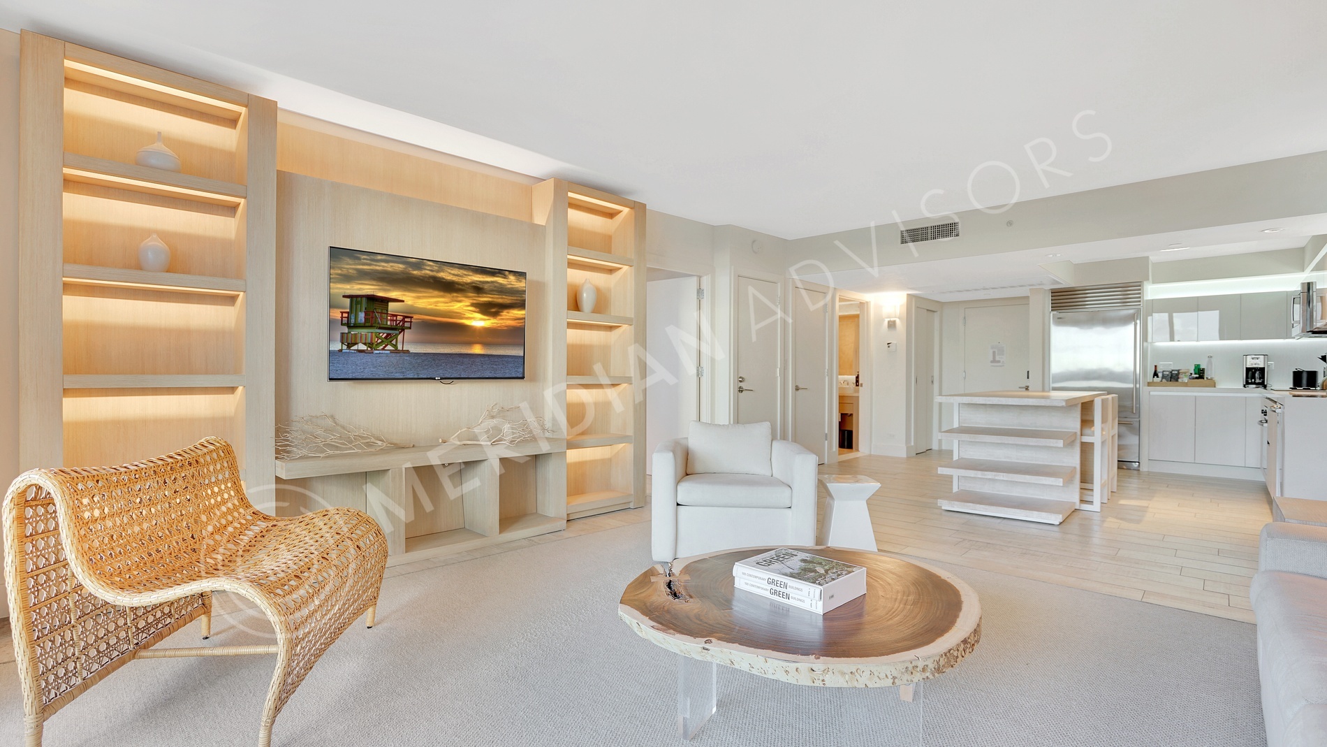 The residential interiors were designed with a rich variety of materials and finishes, an incredible level of detail throughout, and were even fully furnished. The residences include spacious private balconies with spectacular views of the Atlantic Ocean or Miami skyline, custom Italkraft kitchens with built-in lighting designed by Aguiar, stainless steel appliances by Subzero and Bosch, Grohe fixtures and Kohler sinks, all tied together by white quartz kitchen countertops. Bathrooms are swathed in floor-to-ceiling travertine.