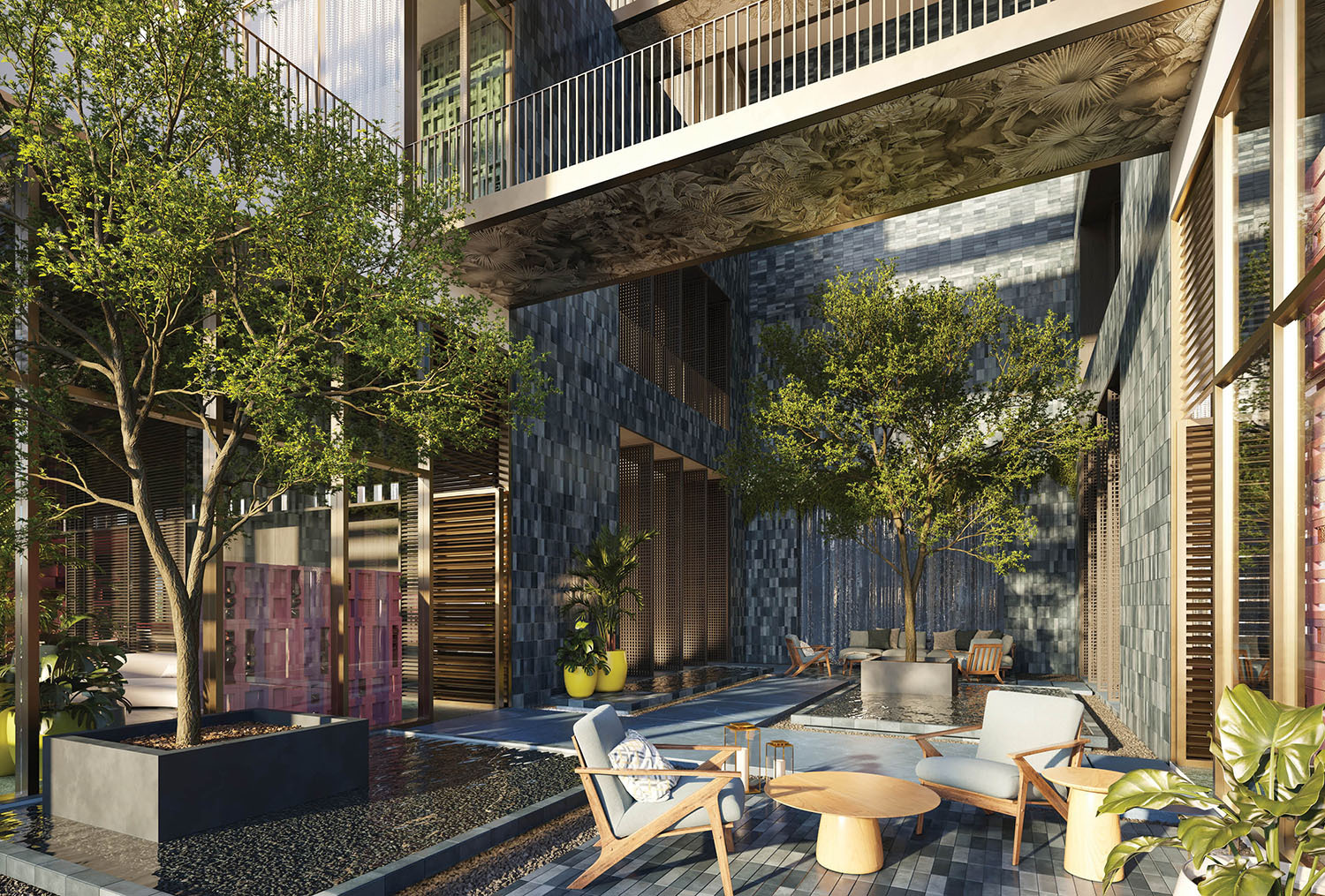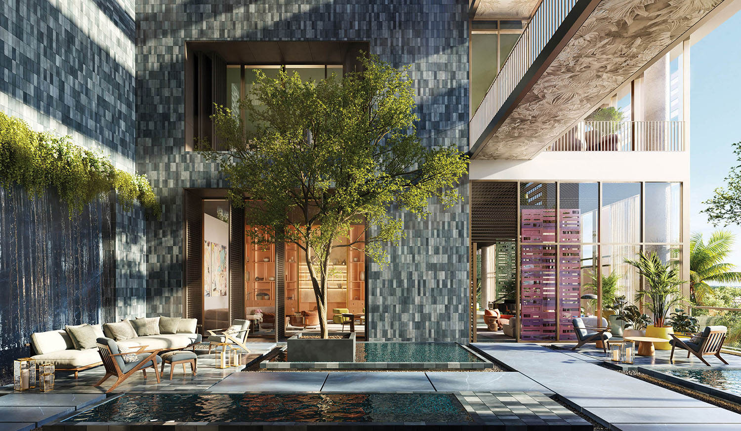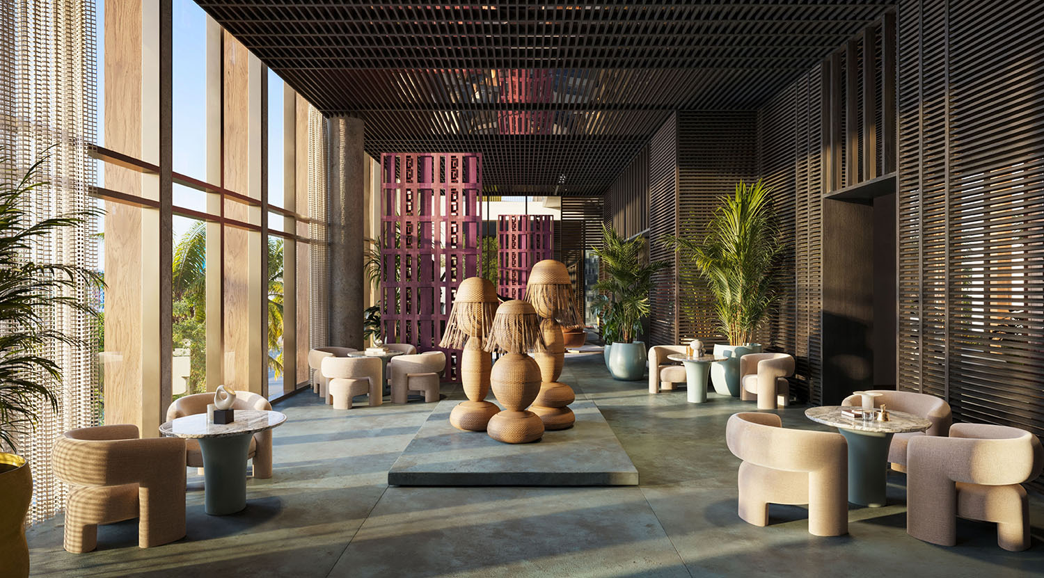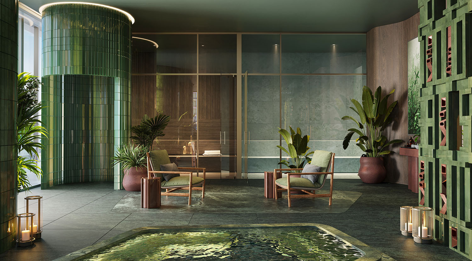 - Lobby and amenity levels by Yabu Pushelberg, immersed in CLAD-designed tropical landscaping and sculpture gardens.