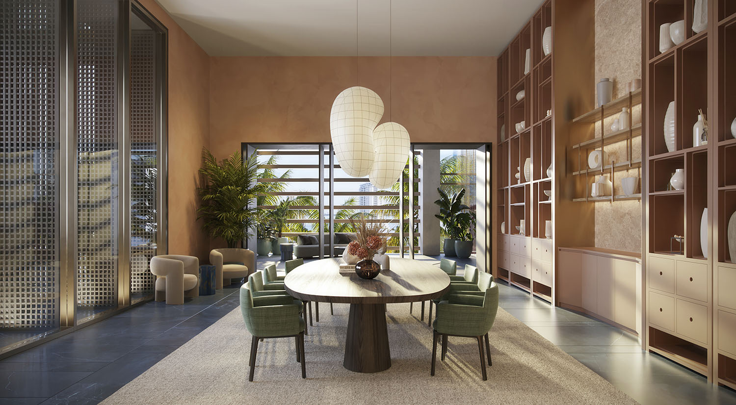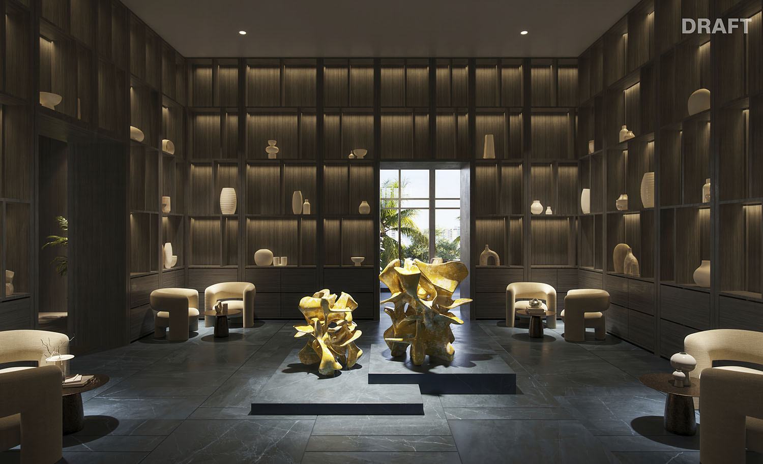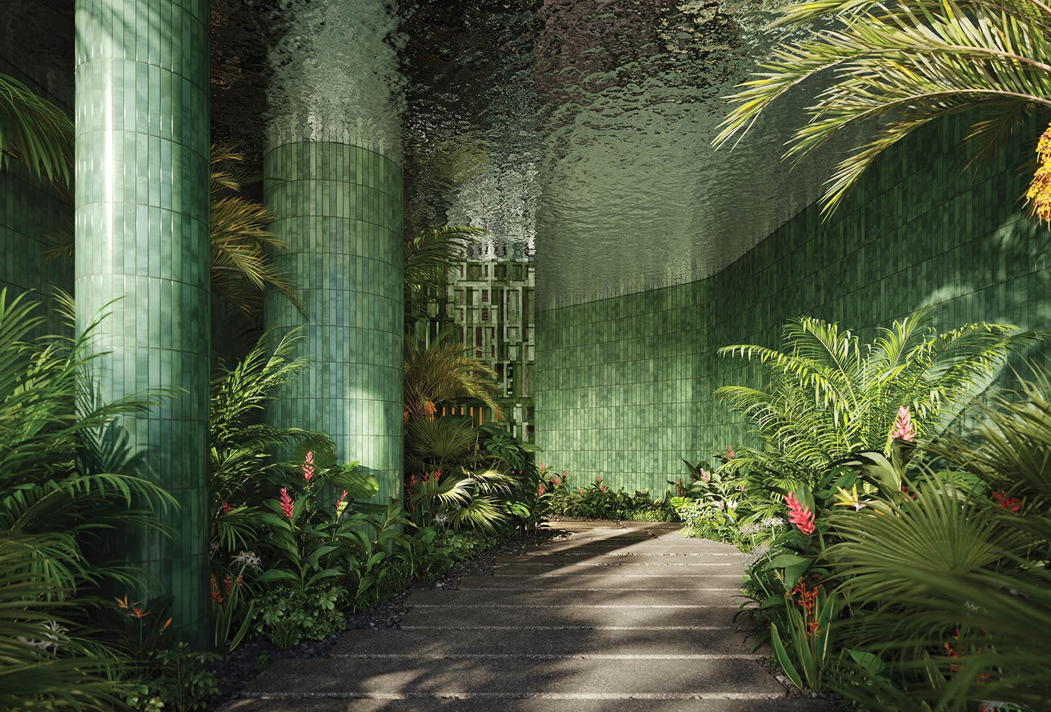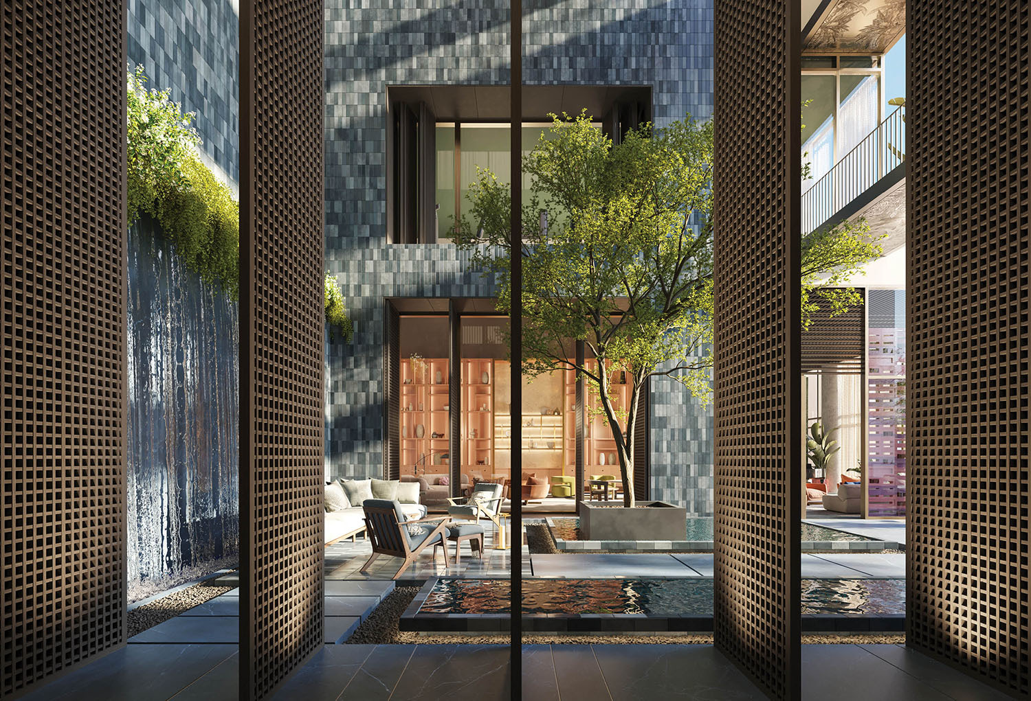 - Lobby and amenity levels by Yabu Pushelberg, immersed in CLAD-designed tropical landscaping and sculpture gardens.
