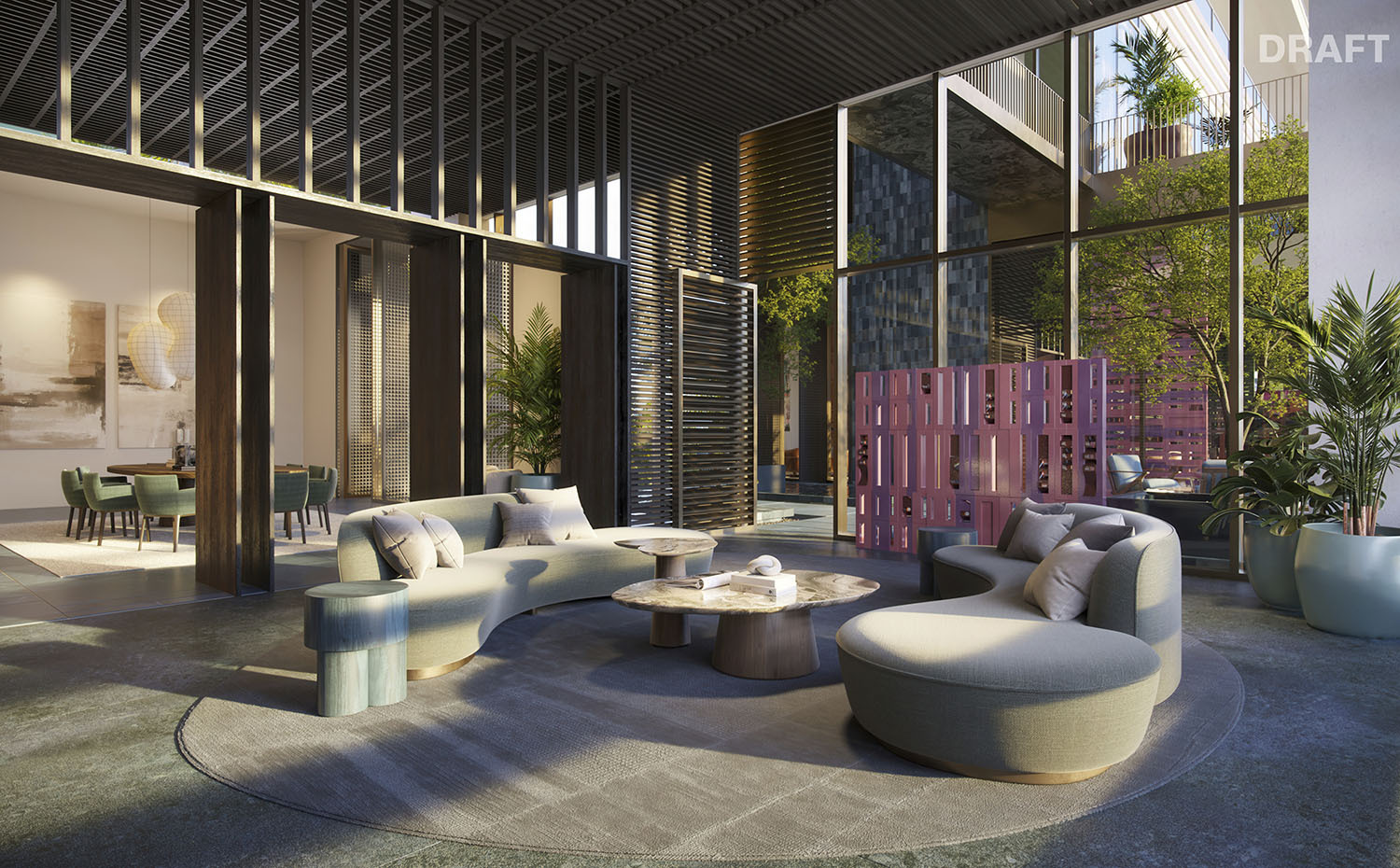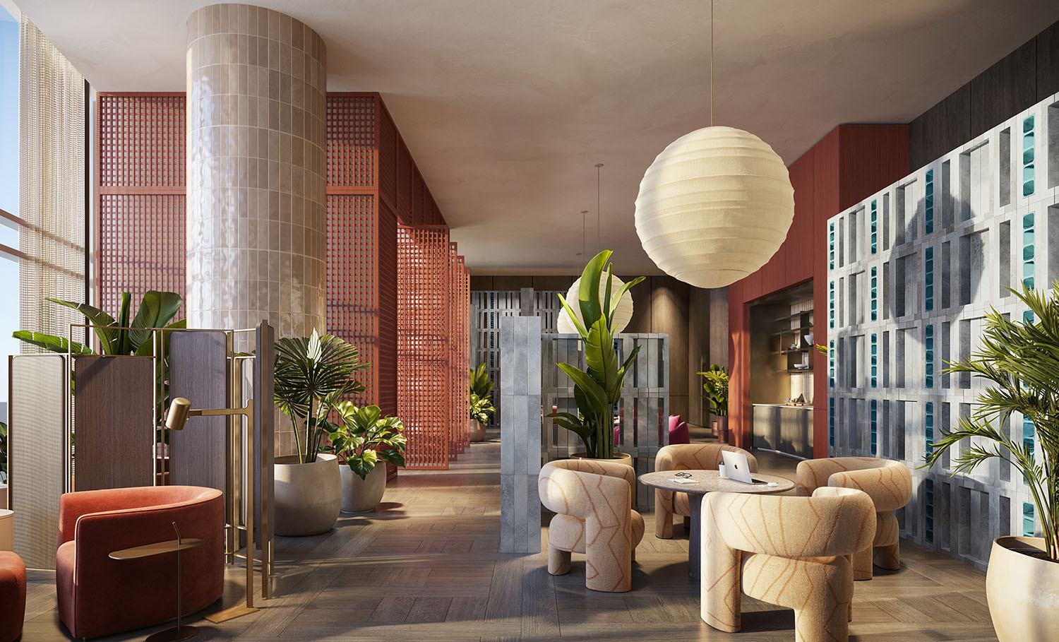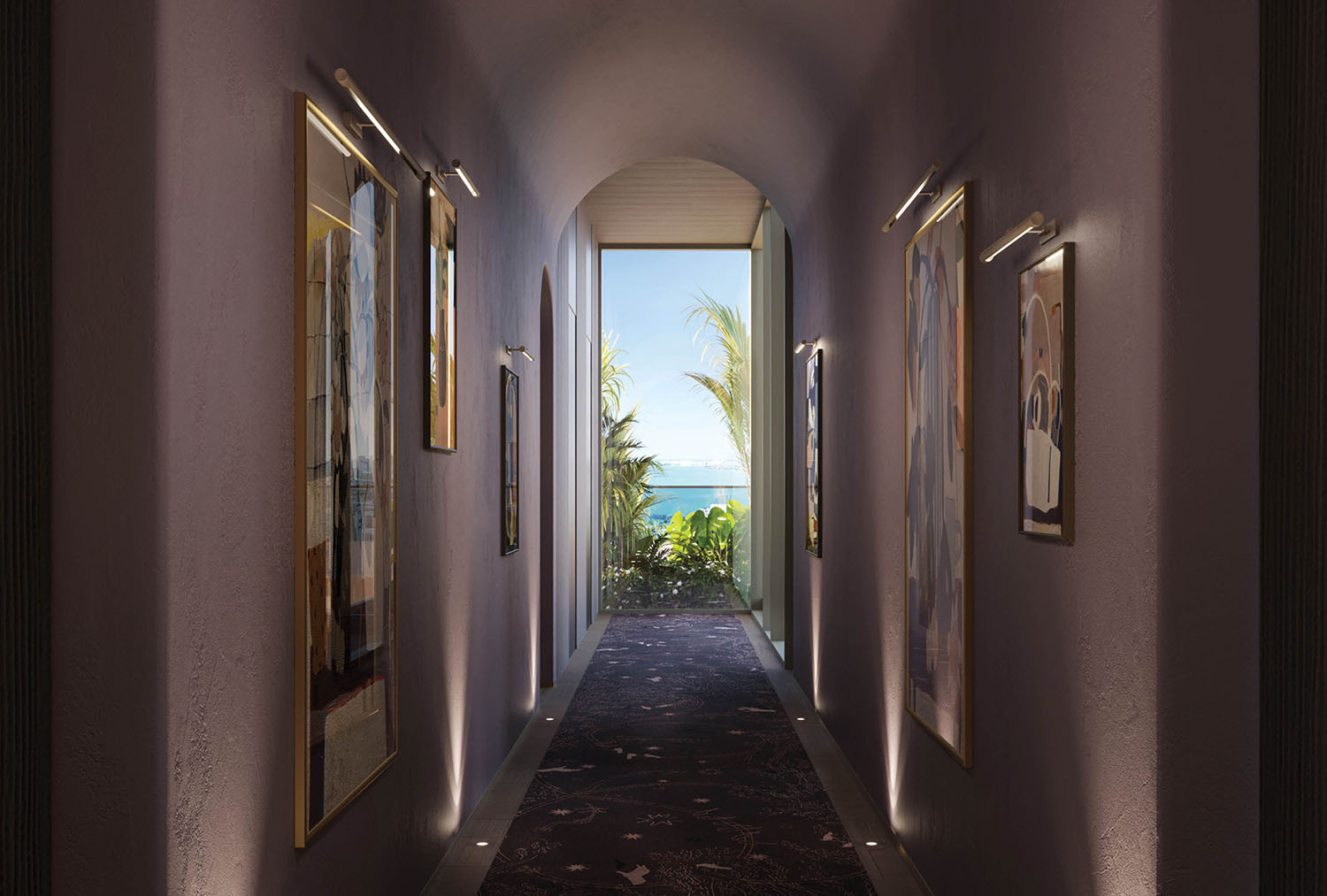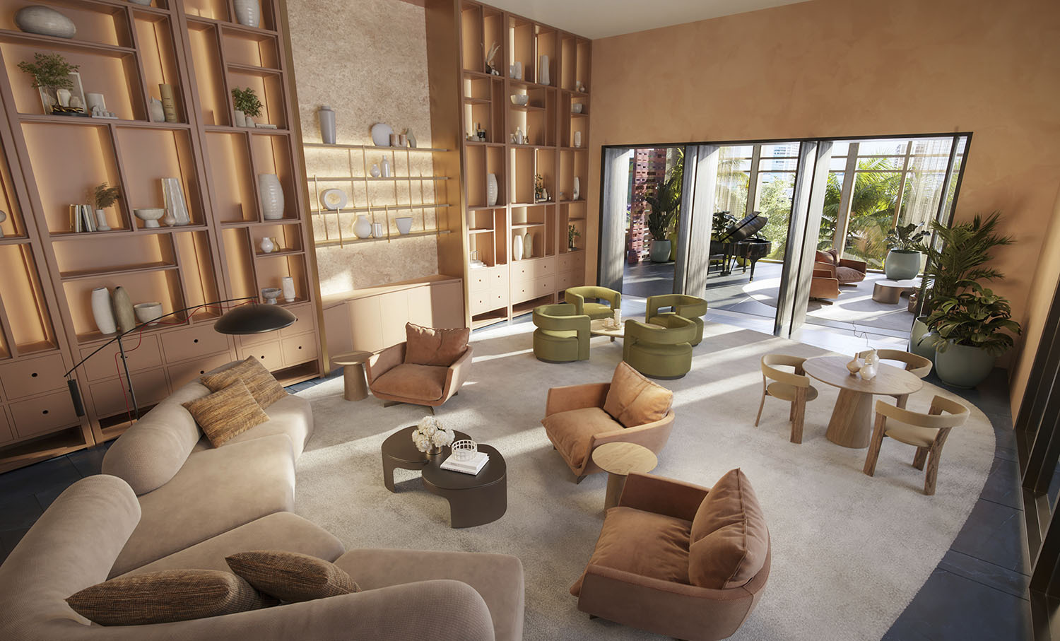 - Lobby and amenity levels by Yabu Pushelberg, immersed in CLAD-designed tropical landscaping and sculpture gardens.