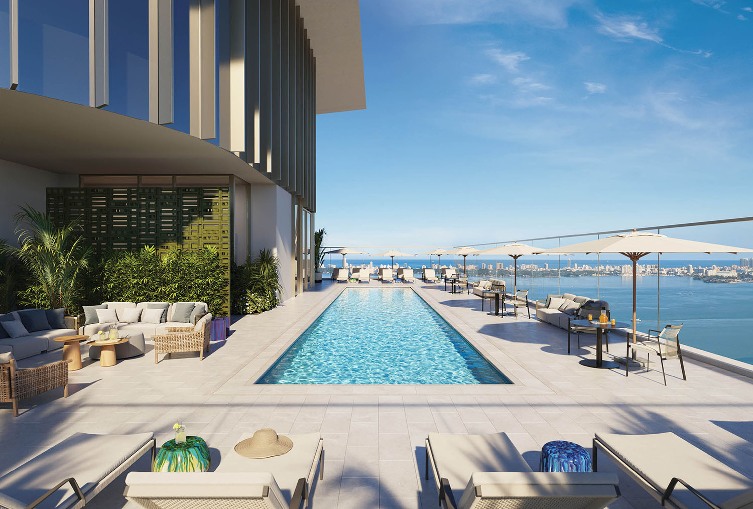 - Rooftop skydeck on level 49 with panoramic pool, sunset lounge and sky bar, archive library, and private dining room with catering pantry.