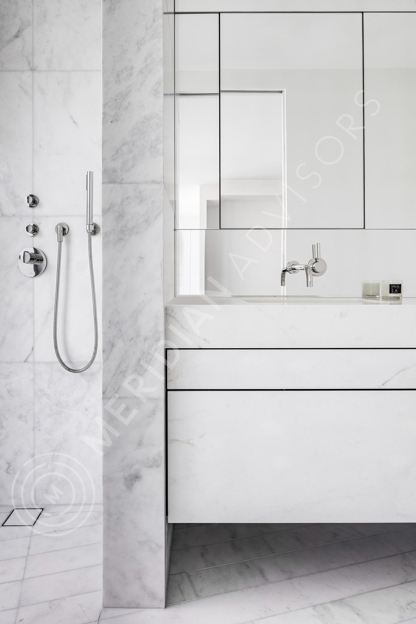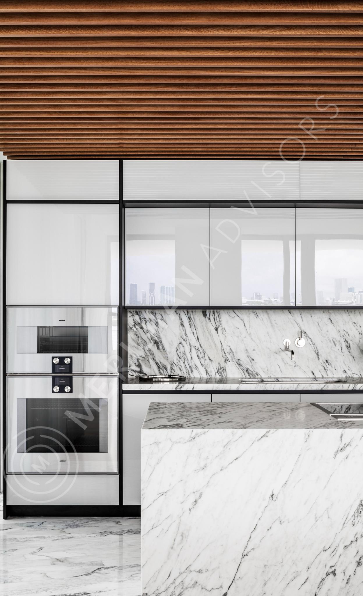 Every one of the spacious units is spectacular. The kitchens were exclusively designed by Nouvel as well, with dramatically cantilevered marble islands, wooden slatted ceilings, fully-integrated state-of-the-art appliances, and high-gloss reflective cabinetry. Nouvel also designed the bathrooms, which are finished with rich, veiny, white marble from ceiling to floor. The extra-large terraces almost double the amount of living space of many units in the building. Penthouses feature two-story great rooms with ceilings soaring up to twenty feet and spectacular private rooftops with pools and shaded pergolas.