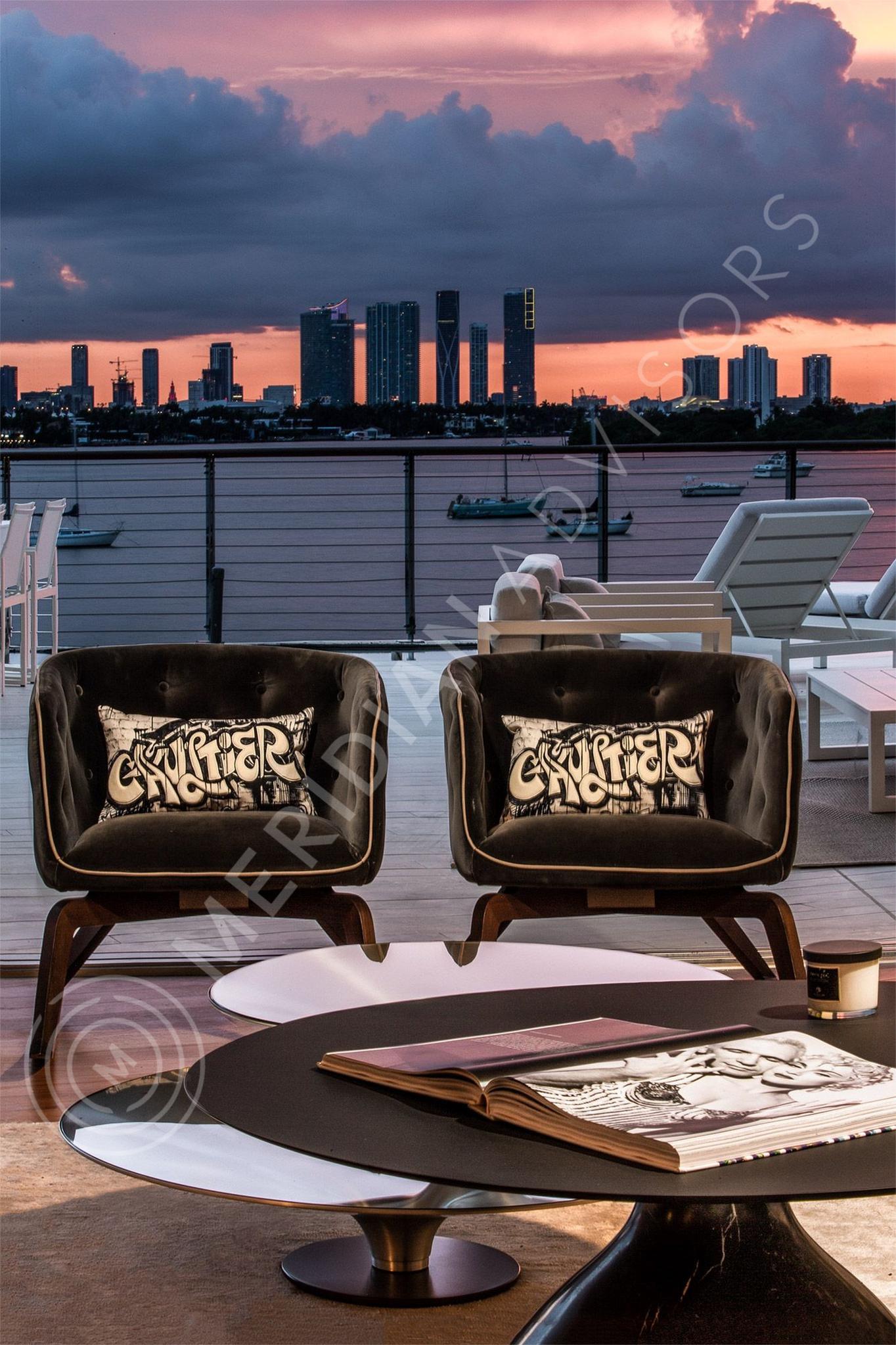 - Sun deck with 116-foot swimming pool and hot tub overlookina Biscayne Bay